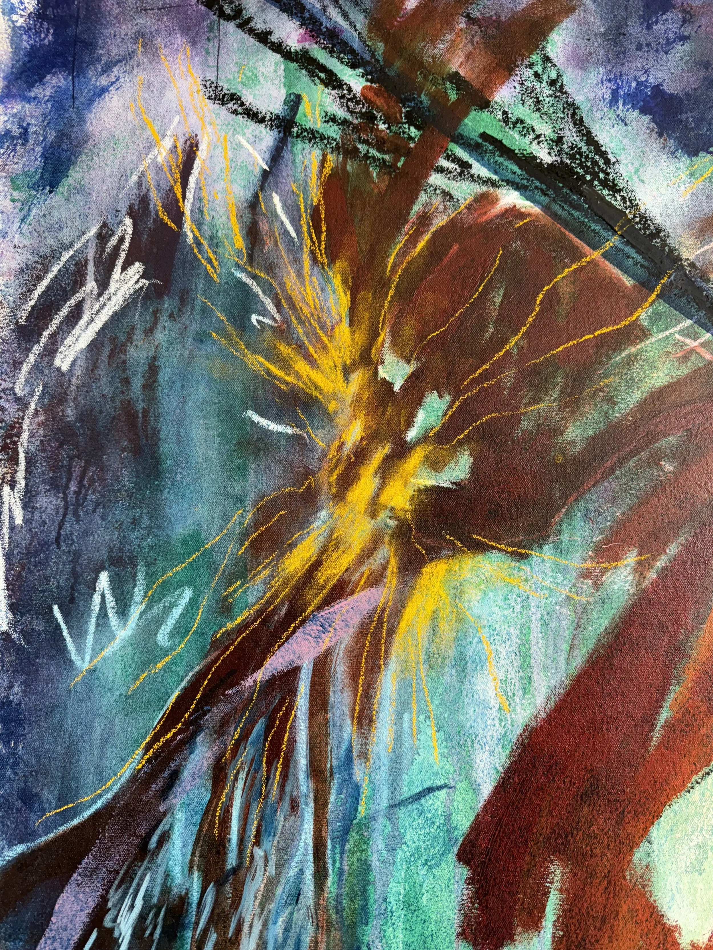 Acrylic paint, soft pastel, and oil pastel on canvas